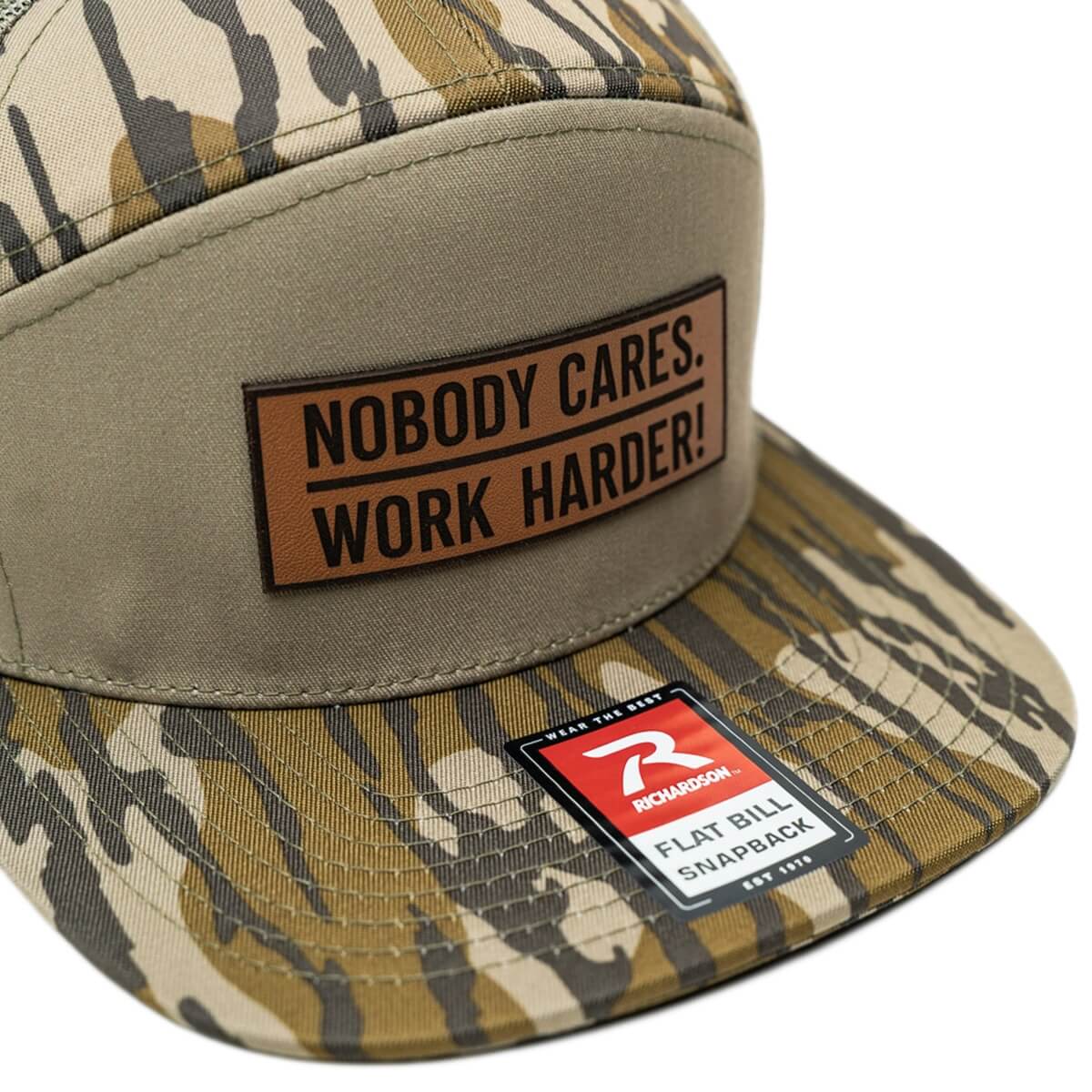 The Nobody Cares. Work Harder! Bottomlands Trucker Hat is built for early mornings in the timber and long days under open sky. Featuring Mossy Oak Bottomland camo and constructed on the trusted Richardson 168 platform, this men’s hunting trucker hat delivers structure, airflow, and durability for the field, the range, and everyday wear.
